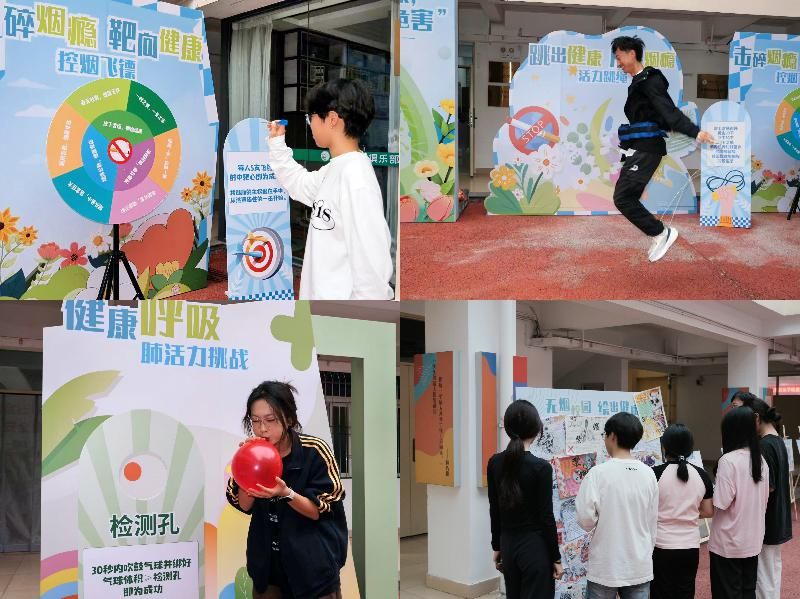 本次活动内容丰富,形式多样,兼具趣味性与科普性,让师生在活动中深化对烟草危害的认识,增强践行无烟生活的自觉与能力。“无烟校园,绘出健康”主题手抄报展示了同学们对“吸烟有害健康”的深刻认识,传递拒绝吸烟的健康理念;同学们在“绿肺计划”竞答打卡趣味问答中筑牢呼吸健康防线;“以香替烟,芬芳校园”手工无烟香薰制作让同学们在动手创造中感受清新空气的愉悦;“健康呼吸”肺活力挑战、“跳出健康,甩掉烟瘾”活力跳绳、“击碎烟瘾,靶向健康”控烟飞镖等多项趣味互动环节,助力师生建立拒绝烟草的主动意识。